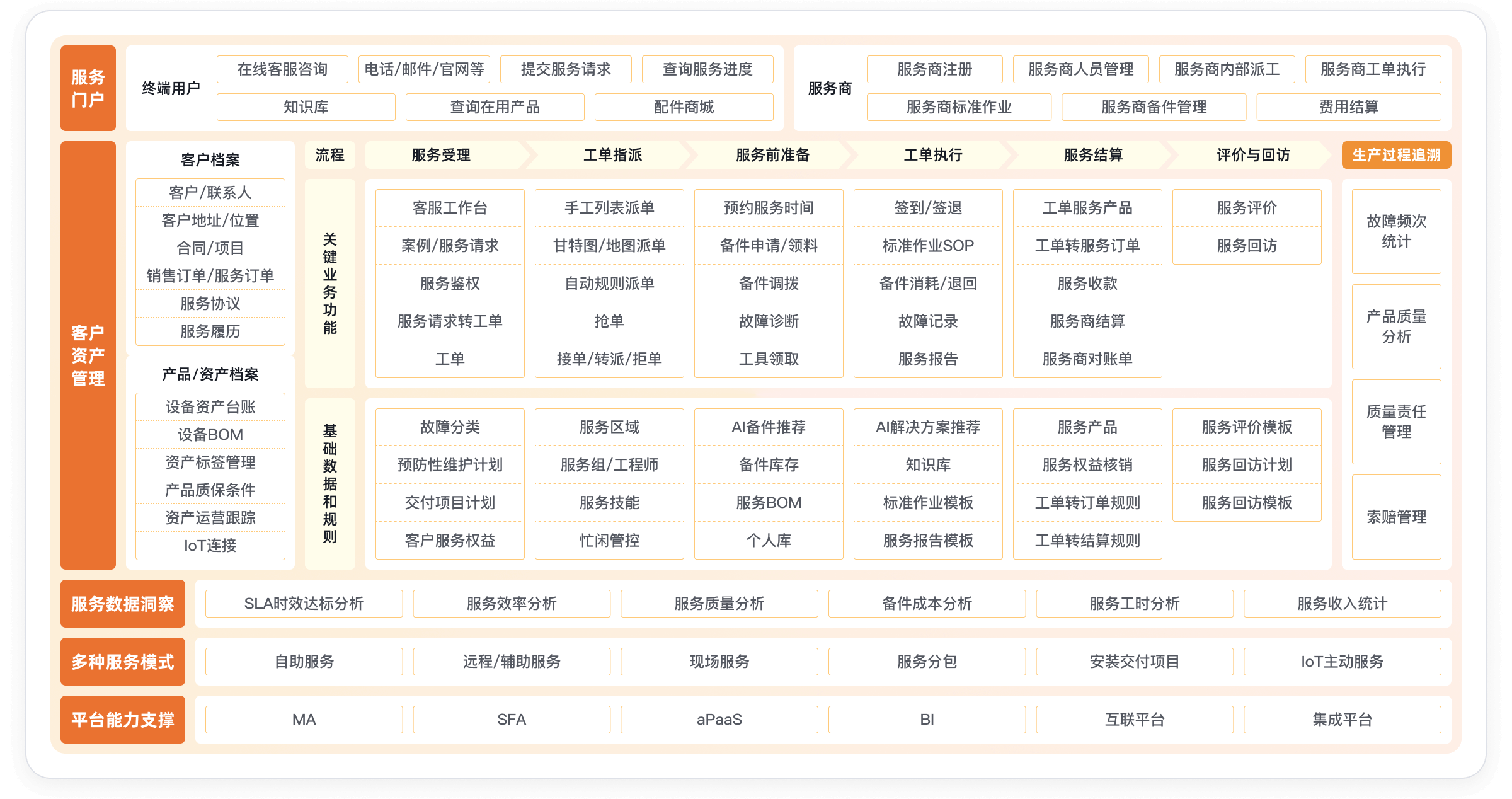 构建以客户为中心,服务工单闭环为基础,建设售后服务体系,实现端到端服务管理过程的流程化、可视化、平台化,及时响应服务反馈,提升服务受理和问题处理效率;