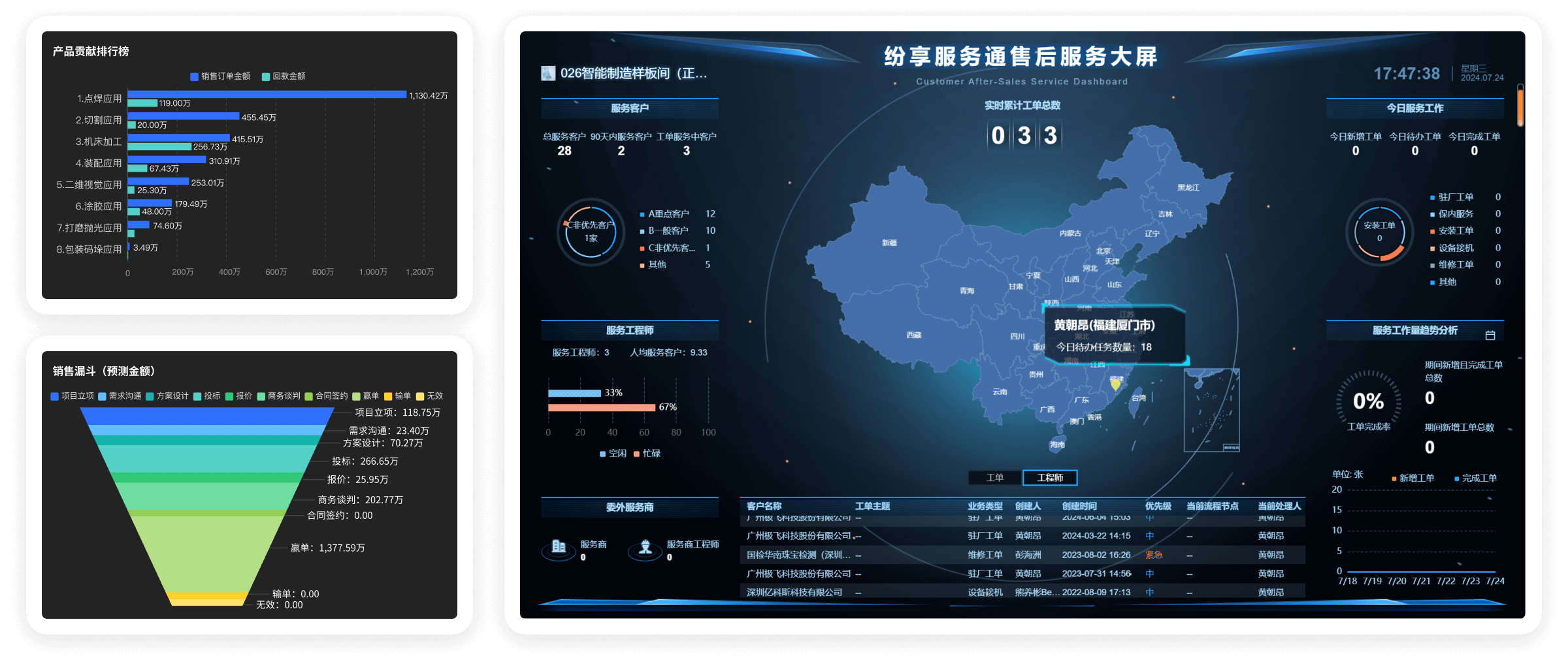 基于售后服务大屏,帮助企业了解工单分布、工程师动态等,实现服务资源按需调度,提升服务效率,提升客户满意度;